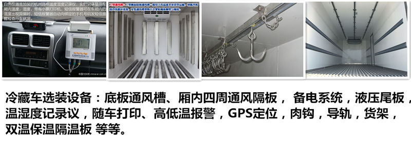 九 选装配置:可选装厢体侧门(单侧门或双开门),可选装铝合金导风槽(导风槽有助于冷气循环,提升制冷效果),可选装厢体顶部加固肉勾滑道(直滑道 或 对接互通式拐弯滑道)。可选装厢体内部采用全面不锈钢材质(海鲜运输必须加装,海水有腐蚀性),可选装280V-380V外接电源(停车熄火后可插电冷机继续制冷工作),可选装温湿度监控记录仪(带打印功能)。